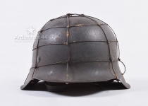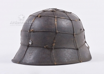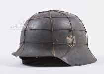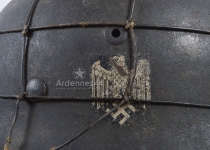 Very nice and rare M42 Heer single decal helmet with a phone wires camouflage system, seen from the top, it has almost a spider web design, the wires are fixed around the liner band, the soldier has done a nice job. The helmet is a « NS64 » with the lot number « B3260 », it is in overall good condition, the decal is still present at more than 90% , the leather liner is in very good condition and still retains its original drawstring and original chinstrap. Nice untouched helmet with a very nice combat look !
